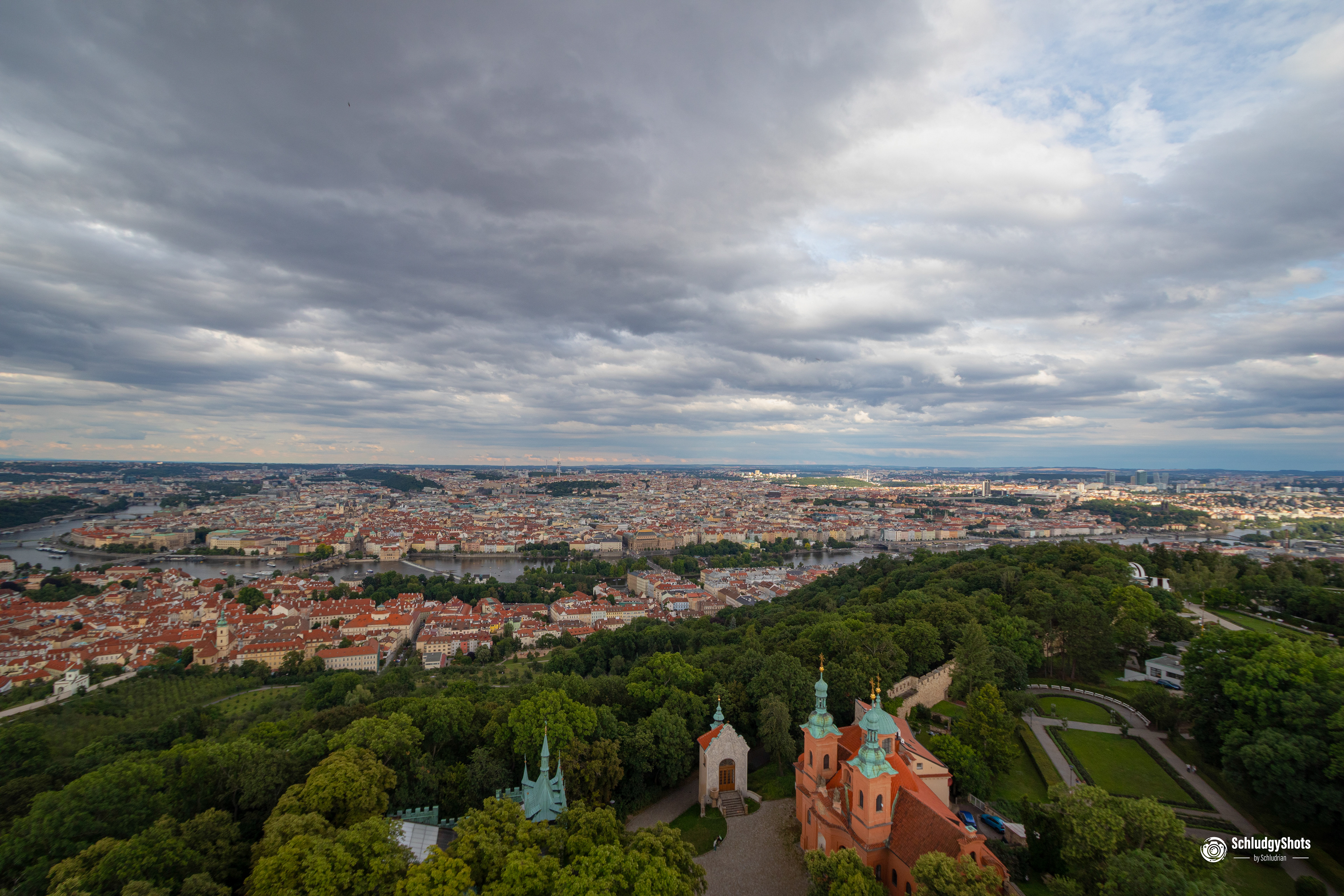 But why do I think it is the best shot of the whole trip? Firstly, the church stands out due to its colour scheme, as the façade is designed in the complementary colour to the oxidised copper roof. The picture is also particularly impressive because of the imposing background. This shows the entire south-east of Prague, while the church towers above the city. It stands amidst ancient, mighty trees in rich shades of green, which in turn are complementary colours to the strong red of the roof tiles.